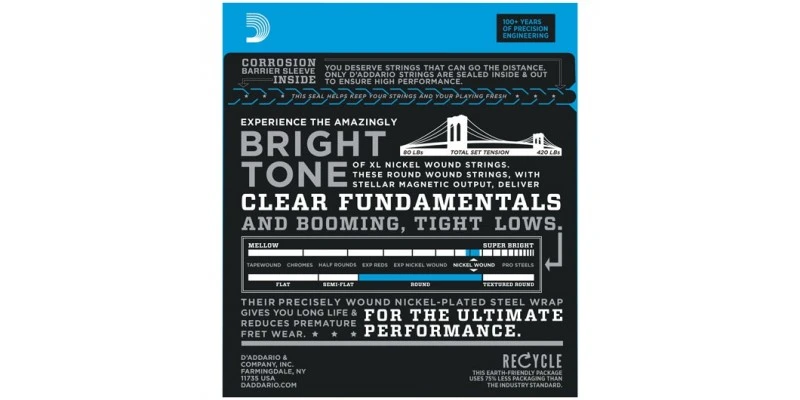 EXL160, D’Addario’s top-selling heavy bass string set, provides the ideal combination of strong overall fundamentals with a booming, tight low end. These strings are designed for medium scale basses (32”+), have a taper at 34″, and are a good choice for players looking to down tune. D’Addario XL Nickel Wound Electric Bass strings are world-renowned as “The Player’s Choice” amongst bass players of all genres and styles. All XL strings are precision wound on our exclusive digitally-controlled machines, ensuring each string has excellent intonation, clear fundamentals, and unparalleled consistency. Each string is wound with a nickelplated steel wrap wire known for distinctive bright tone with excellent magnetic output delivering a universally appealing and versatile tone for all playing styles.