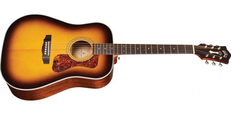 The Guild D-140 Dreadnought in Antique Sunburst features a Solid Spruce top and Solid Mahogany Back and Sides