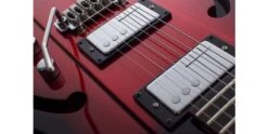Building on the Airsonic’s combination of the best characteristics of both solid body electrics and semis, the Airsonic W comes fitted with a Railhammer Nuevo 90 pickup in the neck position, and a Heavy 90 in the bridge (previously called the Huevos 90). These pickups are as innovative as the guitar itself, providing the tone of P90’s without the hum. Poles over the treble strings and rails of the bass strings provide exactly the right response for each frequency range.