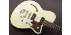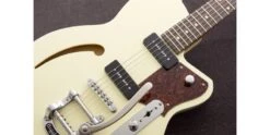 Welcome to the latest exclusive Reverend from Merchant City Music! The Reverend Club King 290 with Bigsby is one of our very favourite Reverend guitars, combining the resonance of a semi-hollow body with the growl of the twin 9A5 P90 pickups. Add in our very own Cream finish – complemented by a Rosewood fretboard and Tortoiseshell pickguard – and you have the coolest semi-acoustic electric guitar out there. Reverend’s Roasted Maple neck is better than ever, and the Bass Contour control continues to offer a virtually-limitless gamut of tones at the roll of a knob. Sublime!