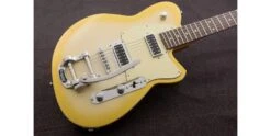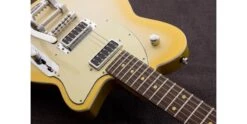 Reverend have also now fitted a Bigsby B-50 trem system, but not without some modifications of their own. Reverend’s secret weapon for Bigsby’s is their soft-touch spring, which transforms the feel for a much more intuitive “broken in” action. This is combined with Reverend’s own roller bridge and Boneite nut, resulting in a supremely smooth vibrato which would be almost unrecognisable to Bigsby users of old. Reverend’s pin lock tuners are also an integral part of the picture, providing a highly stable foundation which allows the vibrato to be operated without fear of nasty string slippages.