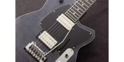 This is the latest version of the Reverend Reeves Gabrels Signature guitar, coming in Satin Transparent Black with Flame Maple top, roasted Maple neck and bound Ebony Fretboard. Originally released in 2008, the Reverend Reeves Gabrels Signature electric guitar has evolved over the years. At Reeves’s request, this latest model returns to the more traditional headstock configuration seen on earlier versions of the model (the most recent previous iteration had a slanted headstock). The guitar is loaded with RG signature Railhammer Pickups for Reeves’s signature tone with outstanding clarity.