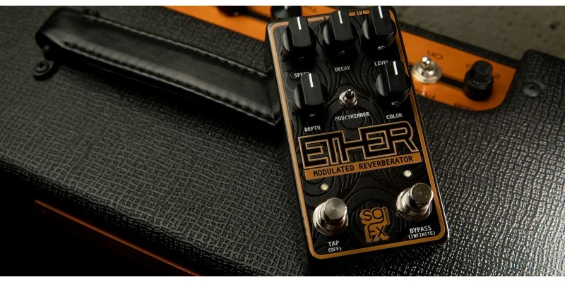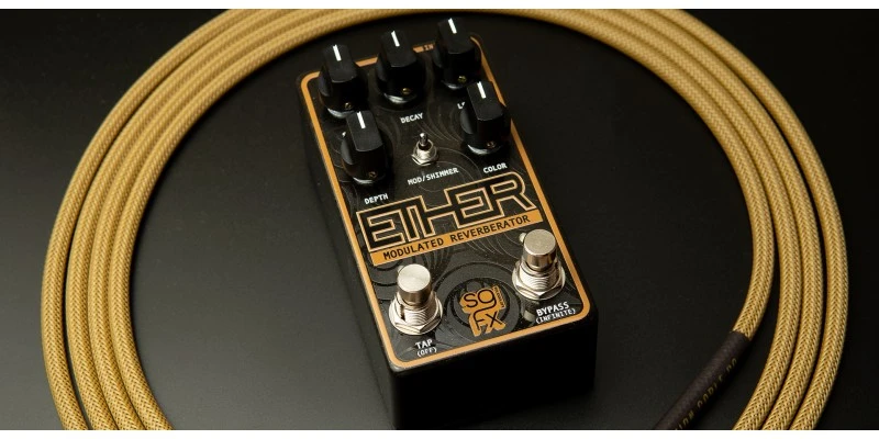 The SolidGoldFX Ether Modulated Reverberator adds modulation to a cavernous ambient reverb, while allowing the player to leave the dry signal unaffected. Vibrato, Tremolo and Harmonic-Tremolo can be added to wet signal, with Tap Tempo. A Selectable Shimmer effect devolves as it decays, while the decay itself can also be manipulated, as well as the tonal colour. A unique and versatile reverb, the Ether again exhibits the unique creativity of SolidGoldFX.