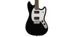 The Squier Bullet Mustang HH in Black features a shorter 24 inch scale length and a hard tail.