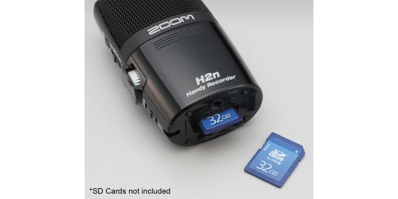 The H2n records directly to SD cards. It supports standard SD and SDHC cards, up to 32 gigabytes.